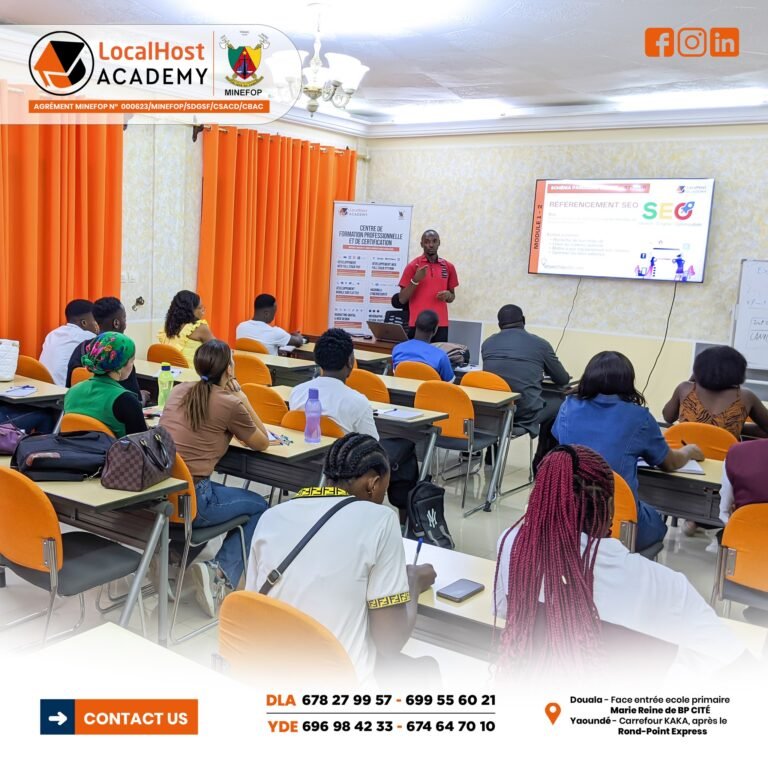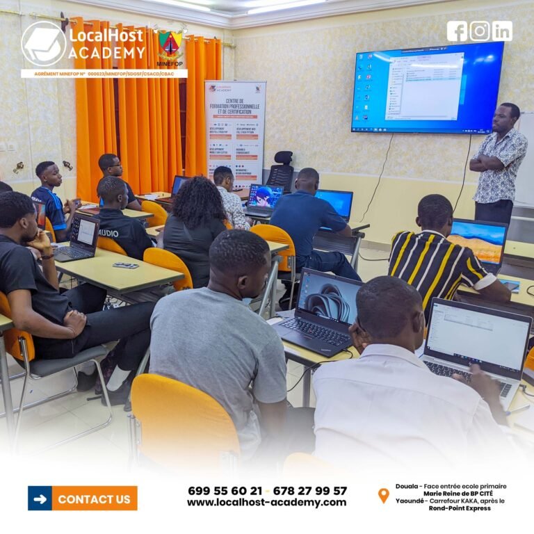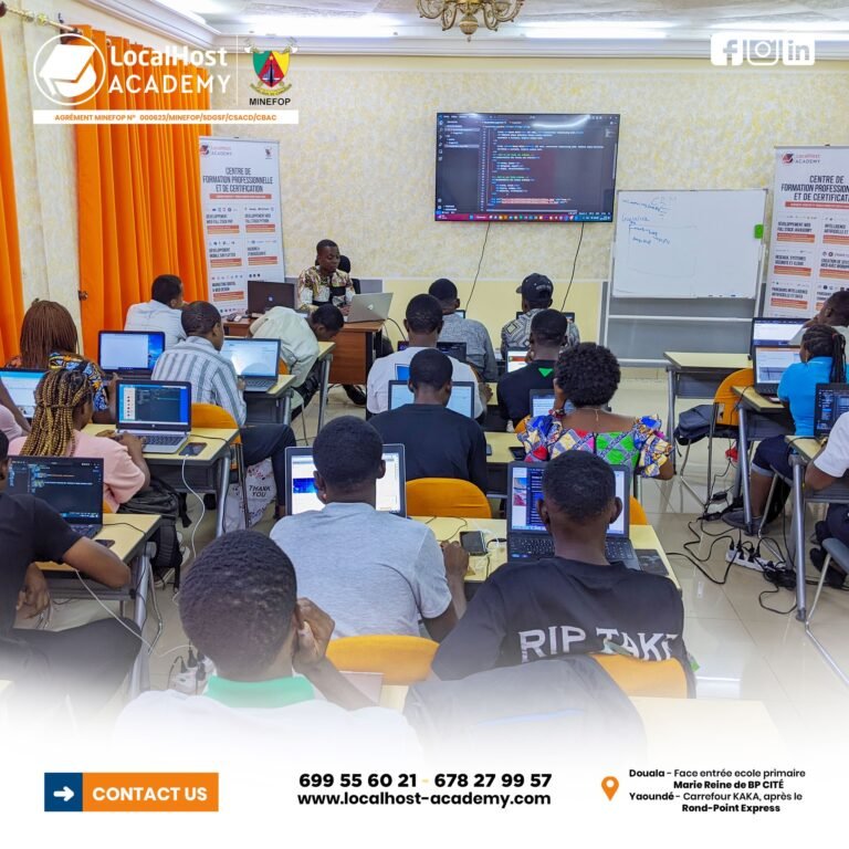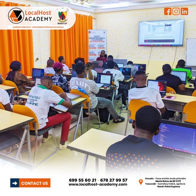 LocalHost Academy est un Centre de Formations Pratique et de Certification aux Métiers du Digital, Agrément du MINEFOP No: 000623/MINEFOP/SDGSF/CSACD/CBAC, situé à Douala et Yaoundé, qui connecte les apprenants avec des Professionnels chevronés, pour des Formations Hautement Pratiques et Axées sur les Compétences et les Certifications, dans les Métiers du Numérique en Forte demande.
