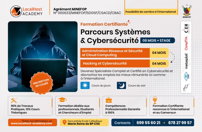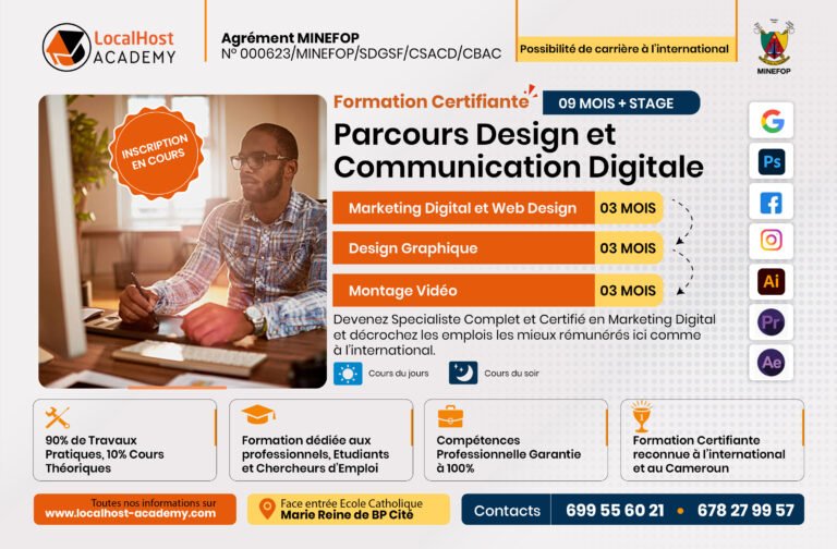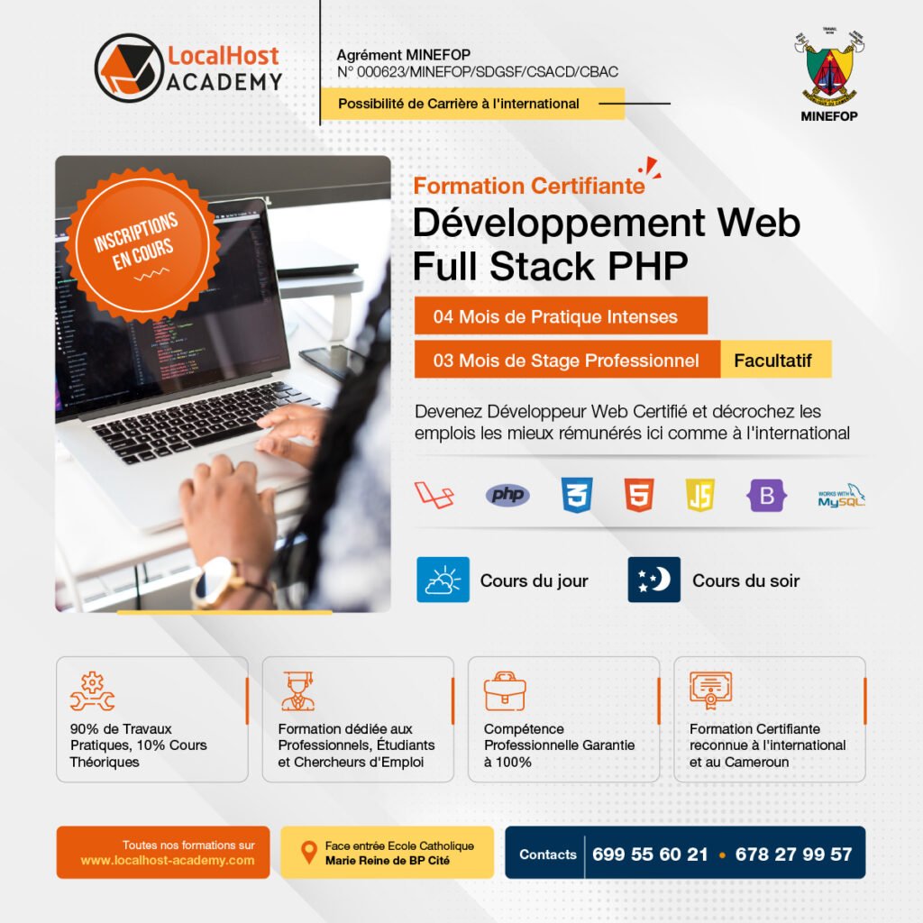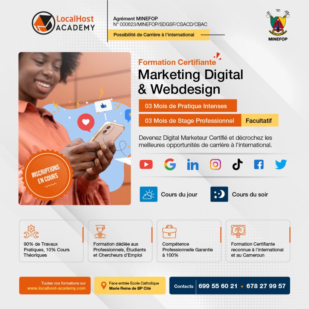 LocalHost Academy est un Centre de Formations Pratique et de Certification aux Métiers du Digital, Agrément du MINEFOP No: 000623/MINEFOP/SDGSF/CSACD/CBAC, situé à Douala et Yaoundé, qui connecte les apprenants avec des Professionnels chevronés, pour des Formations Hautement Pratiques et Axées sur les Compétences et les Certifications, dans les Métiers du Numérique en Forte demande.